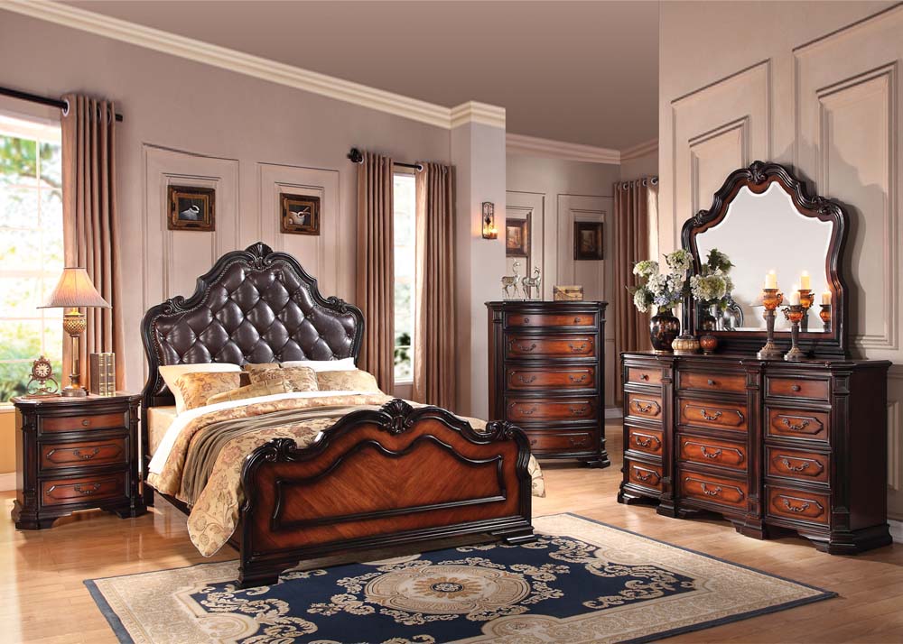 With the look of a family heirloom two tone brown antique finish, Le Havre collection features French Rococo tufted head border with antique nail head boarder and decorative crown pieces paired with pilaster column case pieces.